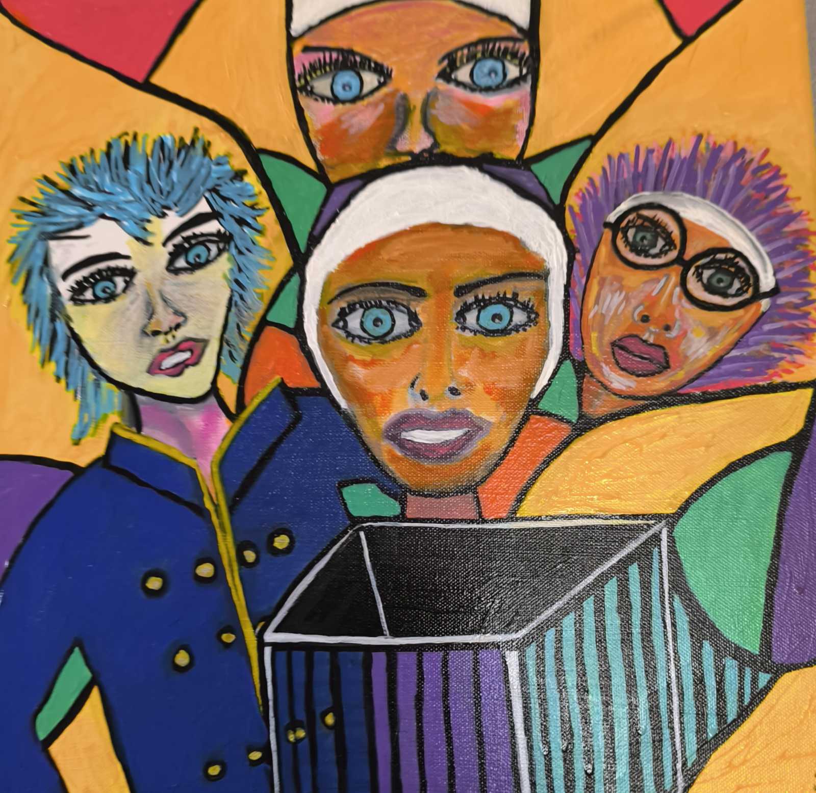 Quatre visages surgissent dans le tumulte des formes, chacun porteur d’une émotion singulière, d’un fragment d’humanité stylisée. Les yeux, vastes et bleus, scrutent l’invisible avec une intensité presque enfantine. Le cube rayé au centre semble contenir les pensées, les silences, les cris. Une chevelure violette hérissée, des lunettes, un manteau bleu à boutons jaunes — autant de signes, de singularités qui s’entrelacent dans une composition vibrante. Regard partagé est une scène intérieure, un théâtre d’identités en dialogue. Les couleurs s’entrechoquent, les contours s’affirment, et dans ce chaos maîtrisé, une tendresse affleure. C’est une œuvre qui ne divise pas : elle relie. Elle offre des visages à ceux qui cherchent des regards.